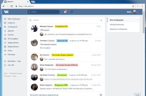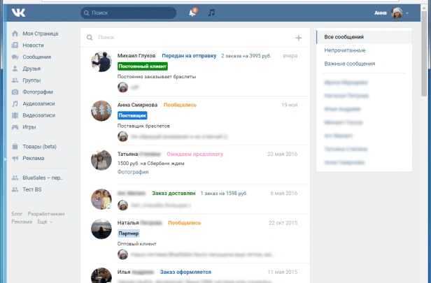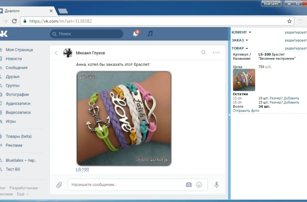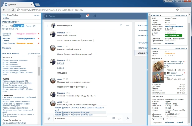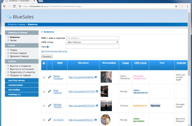 BlueSales — первая CRM для продаж в ВКонтакте. Клиенты, заказы, переписка в соцсетях и мессенджерах. Автоответы, складской учёт, аналитика. Интеграция с amoCRM. 10 000+ пользователей.