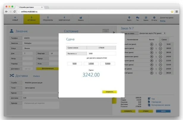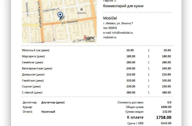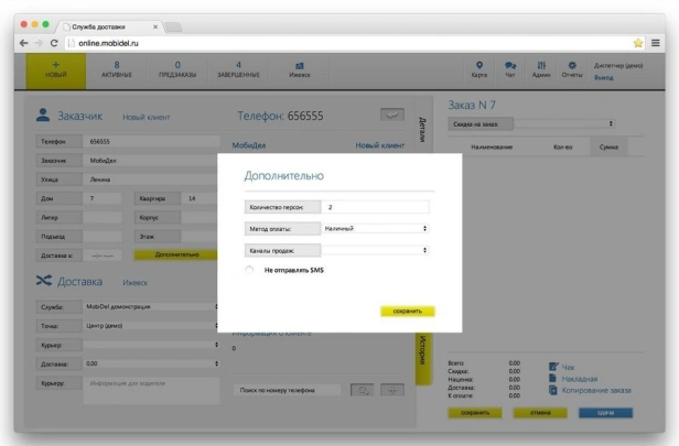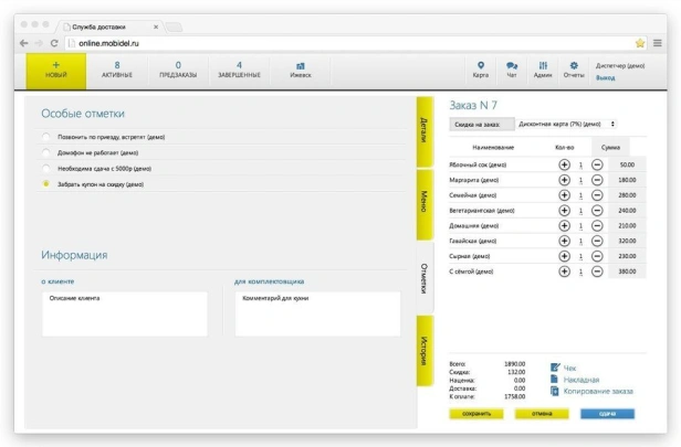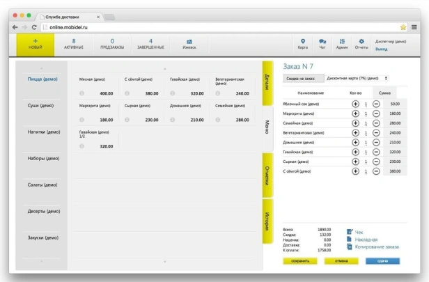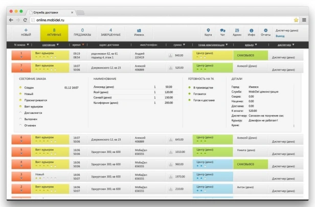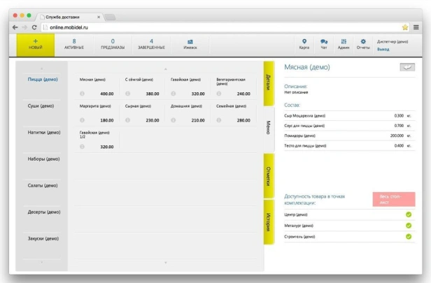 MobiDel — программа для служб доставки еды. Приём заказов с сайта, приложения и агрегаторов. Распределение по курьерам, push-уведомления, карта заказов. Мобильное приложение курьера. В реестре российского ПО.